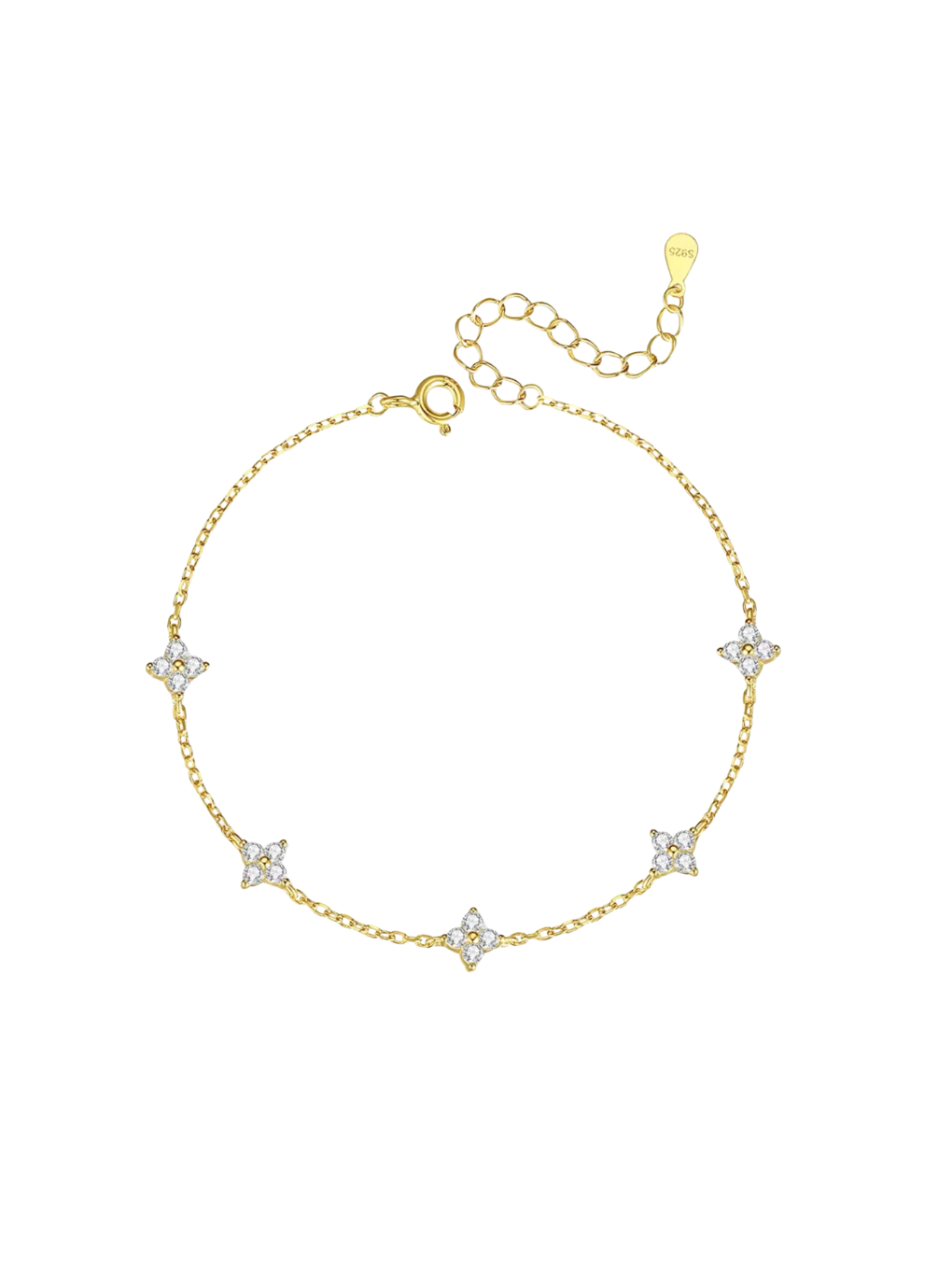 This delicate Clover Bracelet features five gold clovers, symbolizing luck and positivity. Crafted with precision, its subtle design makes it an elegant accessory for everyday wear or special occasions.