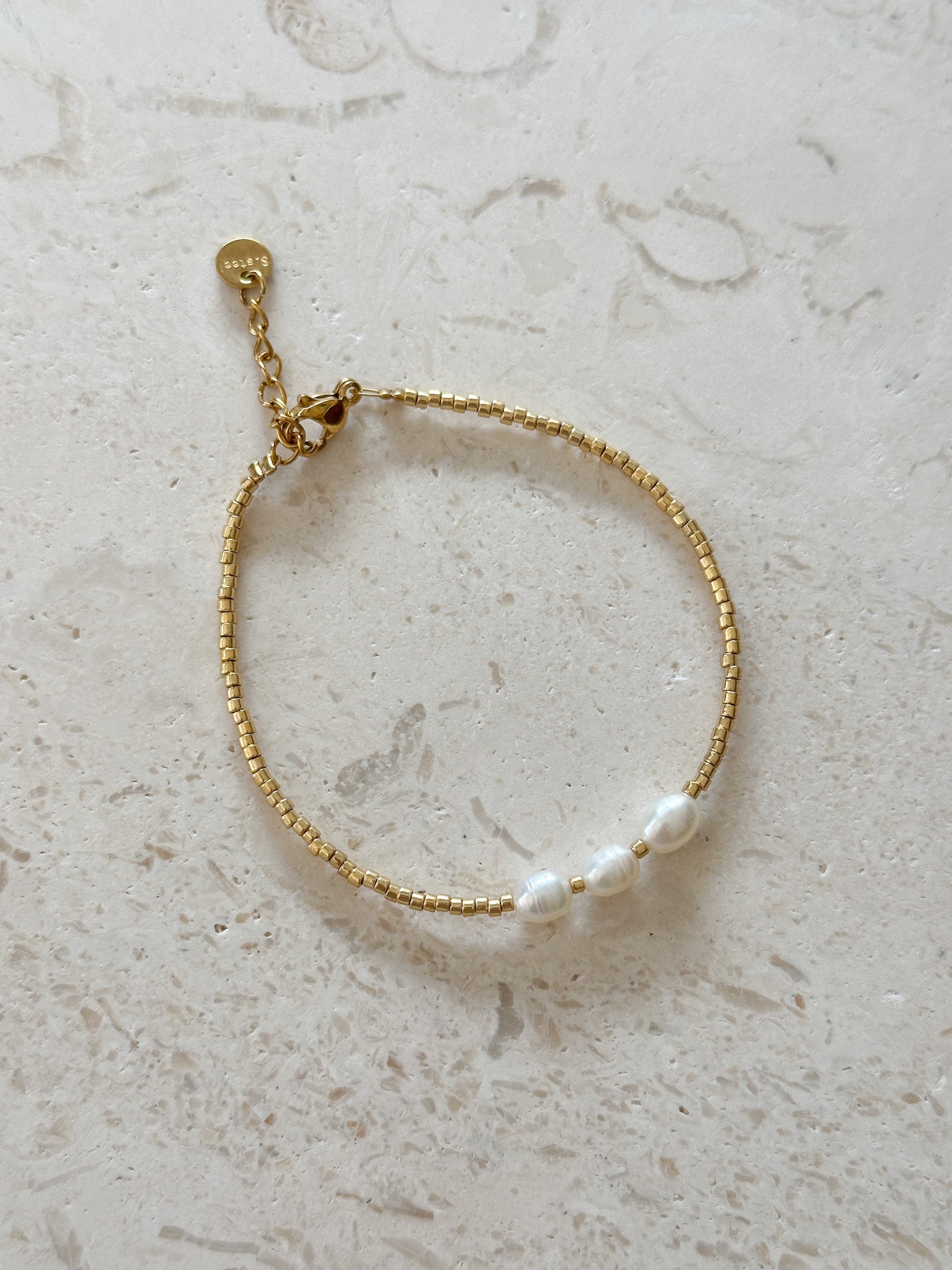Materials: 18k gold plated stainless steel hardware, glass gold seed beads, freshwater pearls