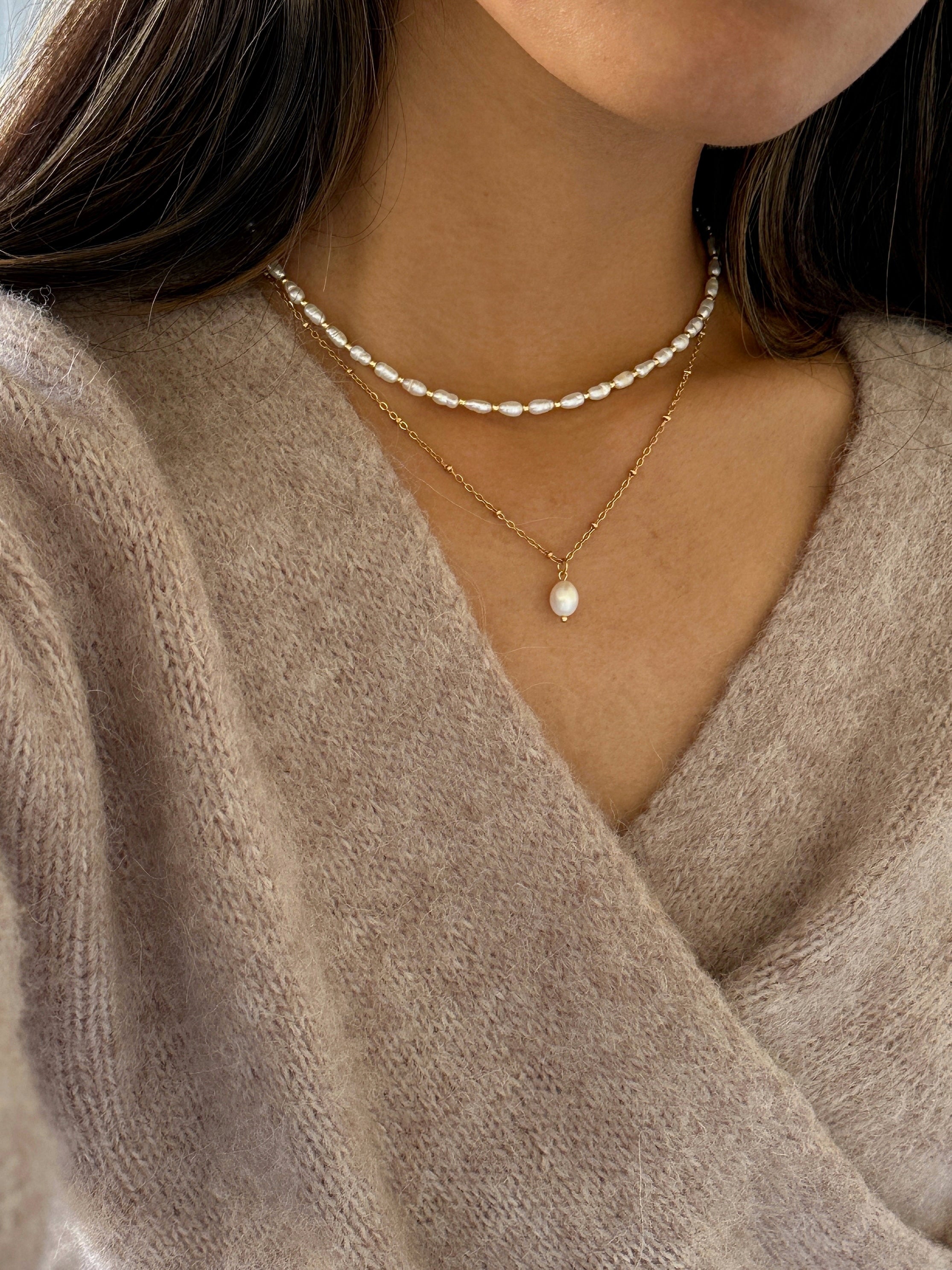 This handmade necklace features luminous pearls, each separated by a delicate gold bead. Timeless and refined, it can be worn beautifully on its own or layered for a curated, elevated look.