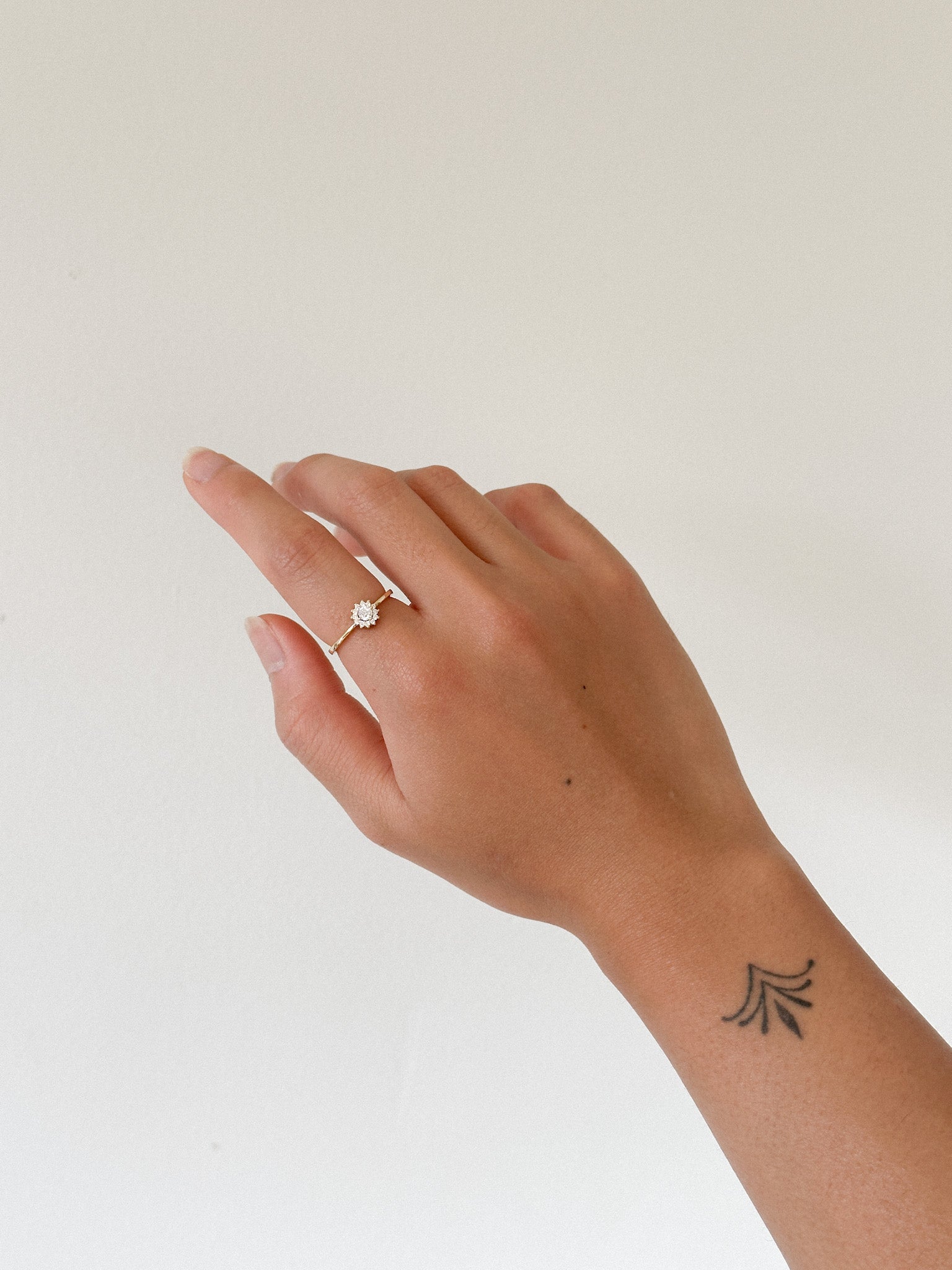 Our Dainty Flower Ring features a delicate floral design, accented with shimmering stones for a subtle touch of elegance. Perfect for everyday wear, this charming piece adds a hint of nature-inspired beauty to any look.